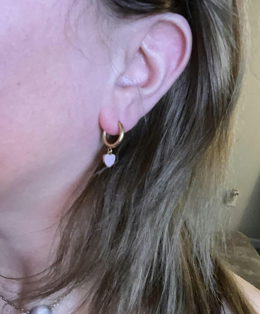 The Ava Charm hoops are lightweight, dainty huggie hoop earrings featuring an enamel pendant heart charm available in pink or white. The endless design of the hoop earrings is the safest option for kids, providing security and ultra-comfortable 24/7 wear. Made with pure medical grade titanium, safe for sensitive skin, and water resistant, the Ava Charm Hoops are ideal for everyday wear.